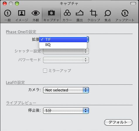 記録フォーマットは環境設定で変えられる。なお、後述するライブプレビューの停止時間もここで変更できる。