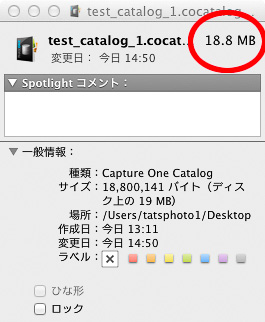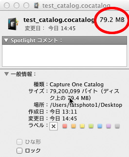 左の例は今回のテストで作ったカタログデータ自体の容量だ。20点ほどの35タイプDSLRのRAW画像をカタログの作成しただけでこのくらいの容量になる。これは主にサムネール画像の容量によるものだ。
