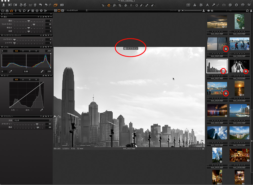 オフラインブラウズになると、ビューワーとサムネイル画像にオフラインのマークがつく。このマークがつくと、画像本体がC1のカタログからのリンクが切れているという印だ。