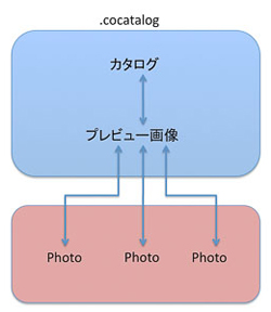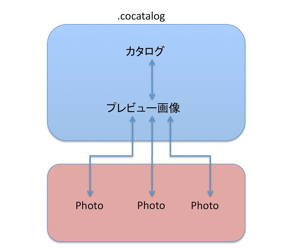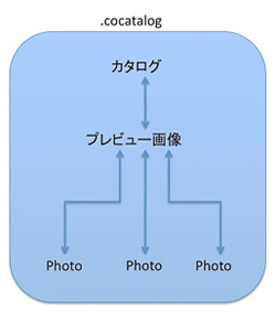このカタログの中に、写真データ、プレビューや処理のパラメータ、タグの情報などが入っている。