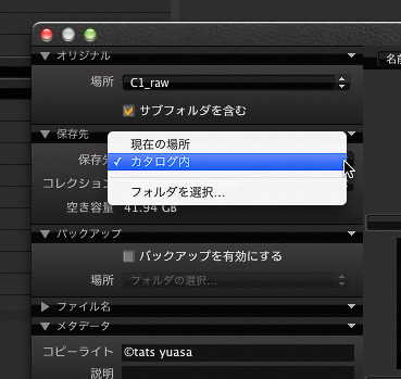カタログで画像を読み込むと左のようにデフォルトで保存先がカタログ内になっている。ここを「現在の場所」に変更する。