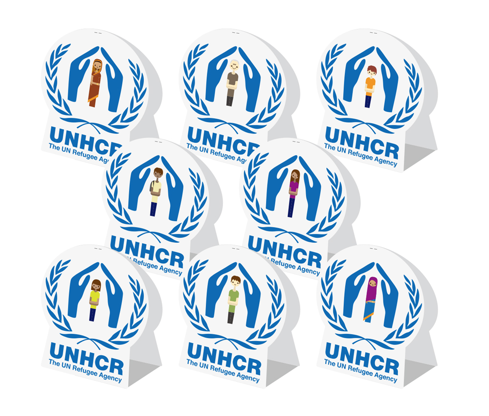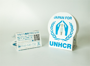 国連UNHCR協会の主な活動の1つとして、街頭での啓蒙と募金活動があり、そこで「つなごう難民プロジェクト」を伝える手段としてチラシを制作した。たき工房さんに依頼し、普通のチラシではなく、目に止まり、持って帰ってもらえるようなツールになった。UNHCRロゴの中心はさまざまな国の難民をモチーフにしている。
