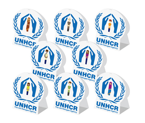 UNHCRロゴの中心はさまざまな国の難民をモチーフにしている。 |