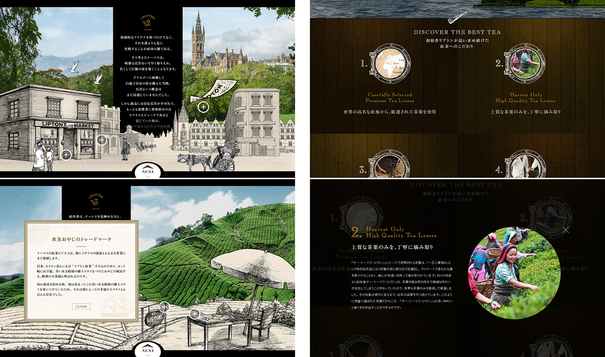 左:「Sir Thomas Lipton」ブランドサイト トップページ/右上:ブランドストーリー コンテンツ/スマートフォンビュー(時間帯によってメインビジュアルが変わる演出も)(クリックで拡大) |