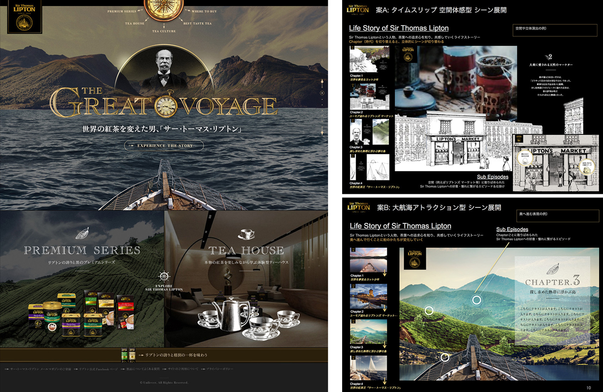 左:ブランドの創始者・サー トーマス リプトンのストーリーが体験できるコンテンツ/右:大航海・冒険感を体感させるインターフェース(クリックで拡大) |