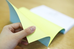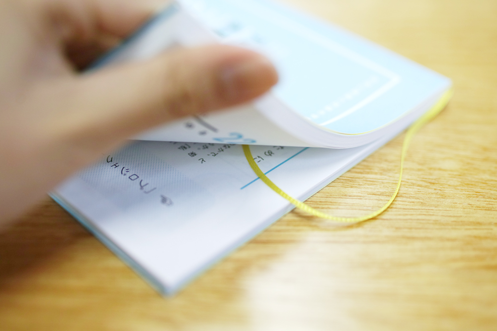 製本はクーターバインディングという、背の部分に筒状の別紙を入れることにより、開きを良くする製本方法です。書き込み式のワークシートが入っているため、この方法を選びました。