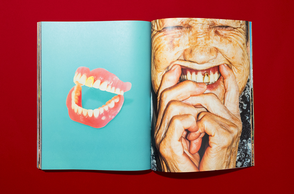 田舎で暮らすおじいさんおばあさんには、HIPHOPのカルチャーと通じた生き方をしているところがある。という発見のもと、ラッパーが口にはめるグリルズのように見える入れ歯や、独自のこだわりを持った農作業着のコーディネートなど、若者のストリートカルチャーとの共通点となるような要素に着目して、それを色鮮やかで大胆な配色とページ構成で見せるようにしました。
