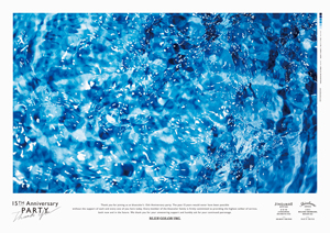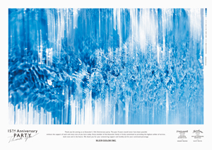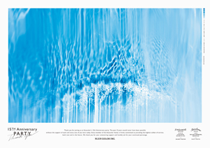 CIの一新と同時に、15周年の感謝を伝えるパーティを行うことになりました。会場には、上記のB0サイズのポスターを壁いっぱいに展示しました。いくつかの写真は、両サイドから起こした波を縦位置で撮影したものでしたが、ポスターではあえて横位置に使用し、写真の中での距離感や空間感を曖昧にすることで、水が生み出した見たことのない表情を強調しました。