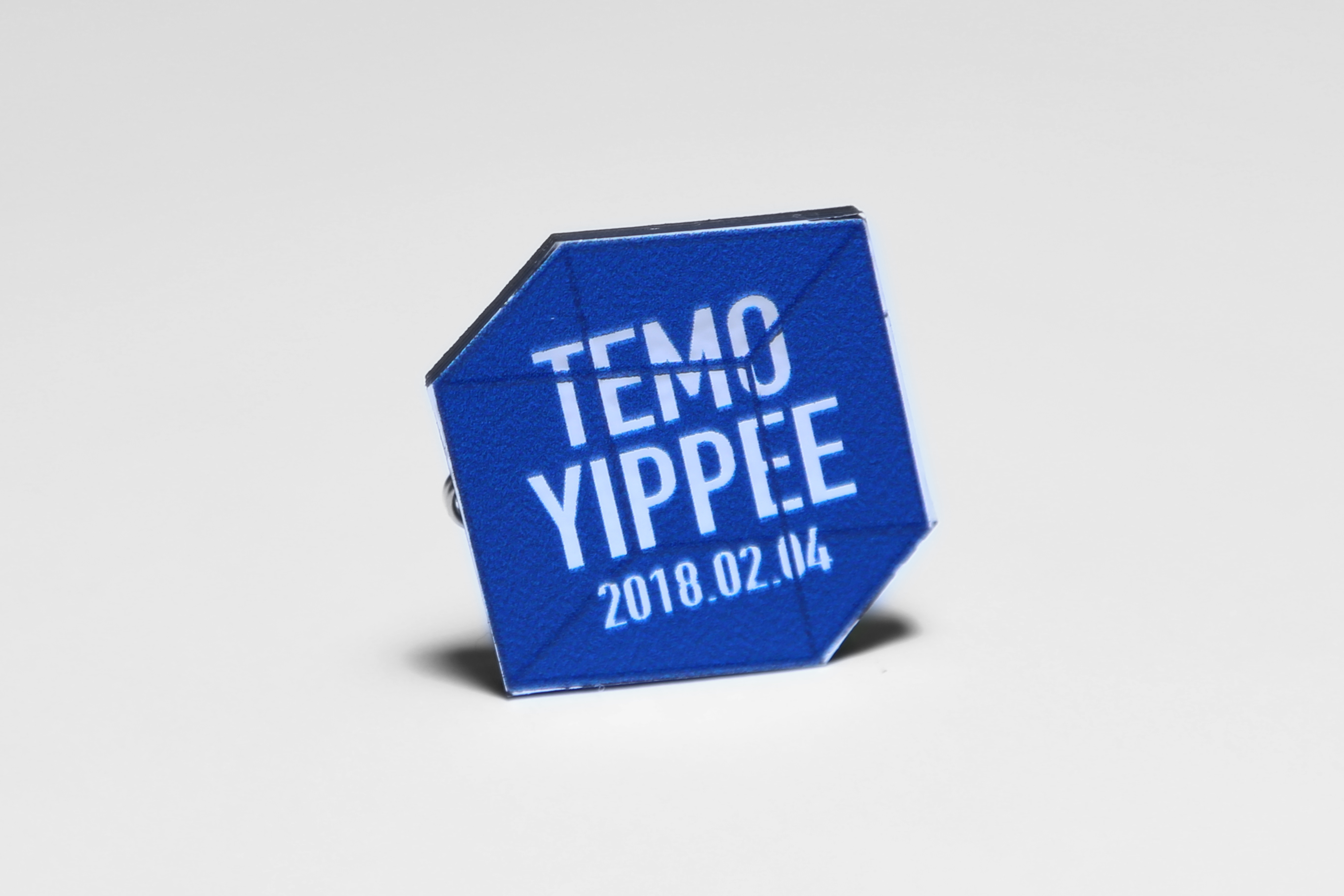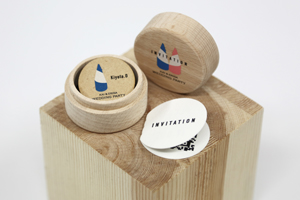 招待状は、パーティのとき、実際に身につけて来られるアイテムにしようと思い。ロゴマークを入れたバッジを制作しました。アルミ蒸着紙にUVインクジェットでプリント。文字部分を箔押し風にし、リッチ感を演出。