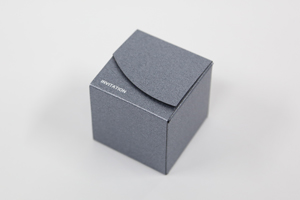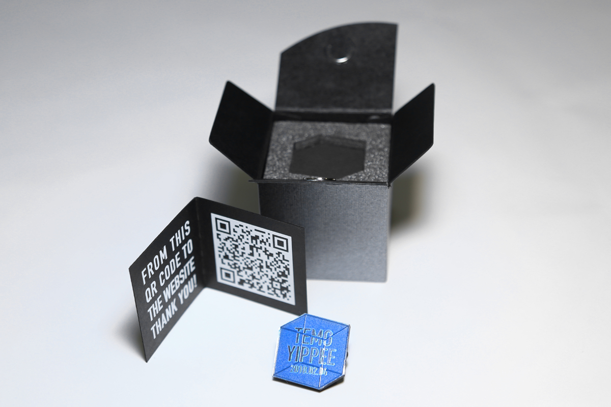 黒の厚紙にやや光沢のあるグレーの紙を合紙し、シックだけど暗くなりすぎないように、そして中のバッジが際立つようにしようと思い、箱の素材選びには気を使いました。そこに、バッジとWebサイトへ飛べるQRコードをプリントしたミニリーフを入れて完成。かなり「モノ感」のある招待状になりました。