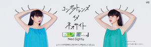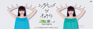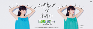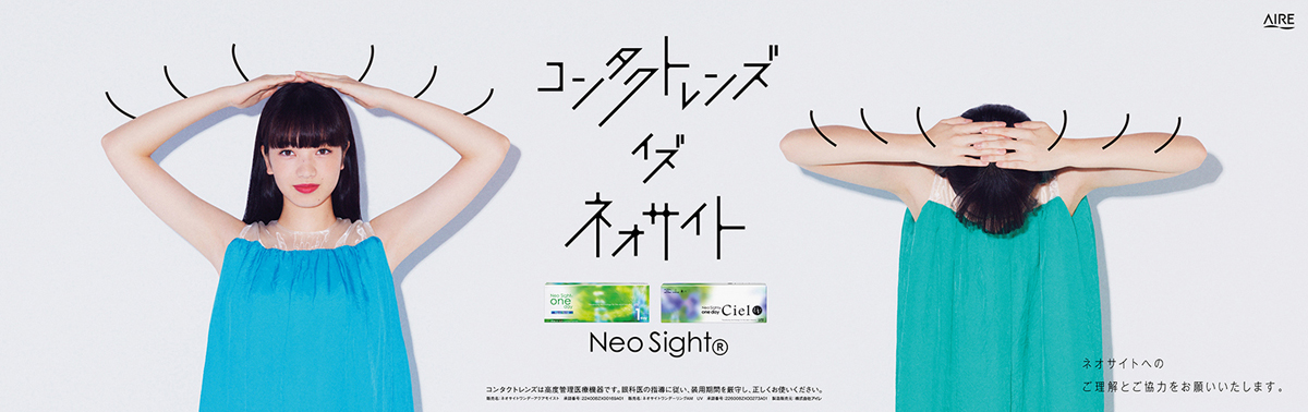 初めて担当した「ネオサイト」シリーズの広告では「商品名を強く印象づけたい」という明快なオリエンだったので、目に扮した小松さんが「コンタクトレンズ イズ ネオサイト」と言い切るシンプルなビジュアルになっています。右を見たり、寄り目になったり、ウインクをしたり…小松さんの動きでさまざまな目を表現し、全4点のシリーズで中吊りジャックを実施しました。