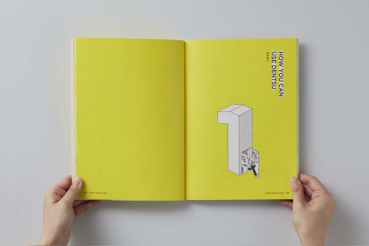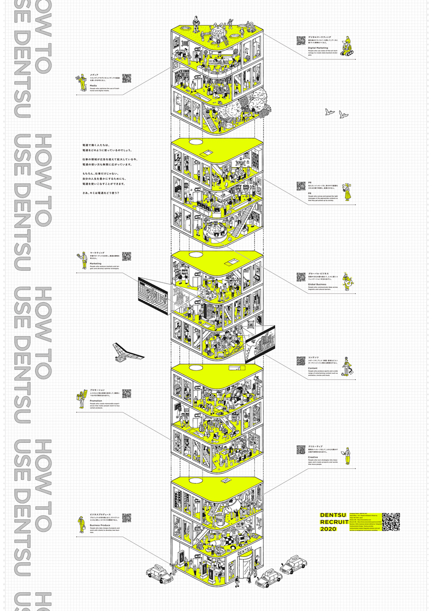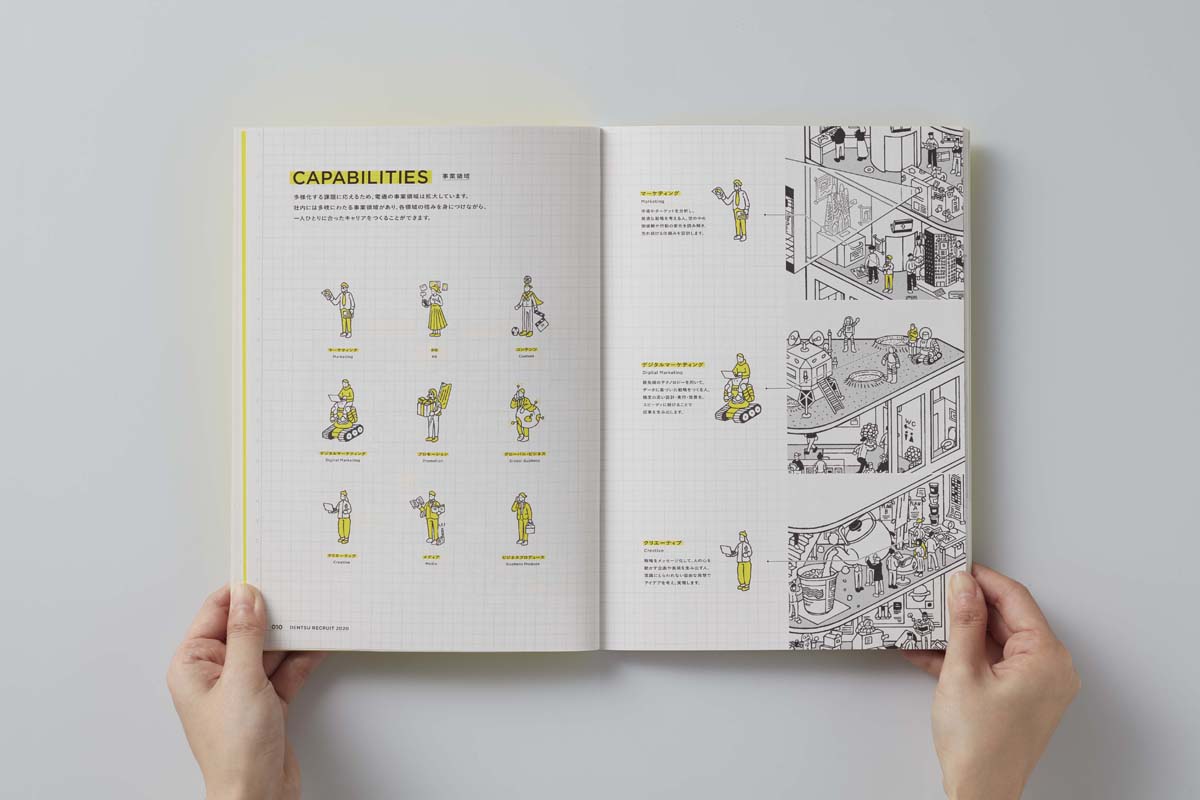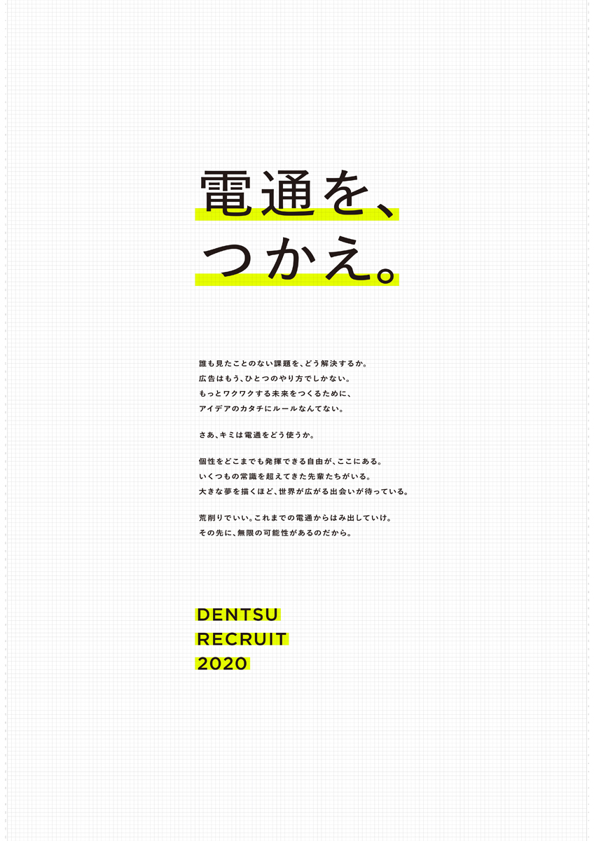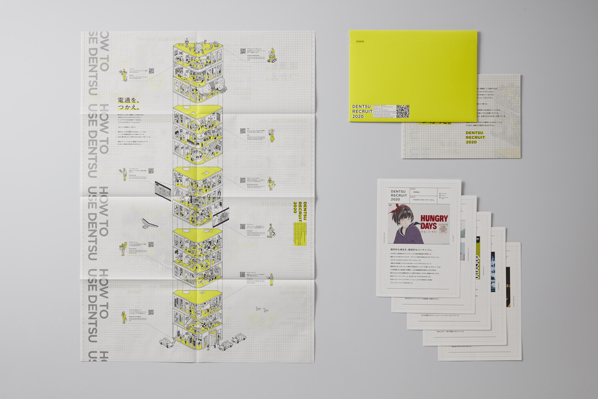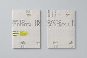 電通の新卒採用のアートディレクションを担当しました。チームでの打ち合わせの中で、「電通を、つかえ。」というコンセプトが早い段階で決まり、デザイン上のコンセプトは「電通の取扱説明書」に設定しました。方眼紙のイメージや、解説のようなイラストレーションのイメージを徐々に固めていきました。