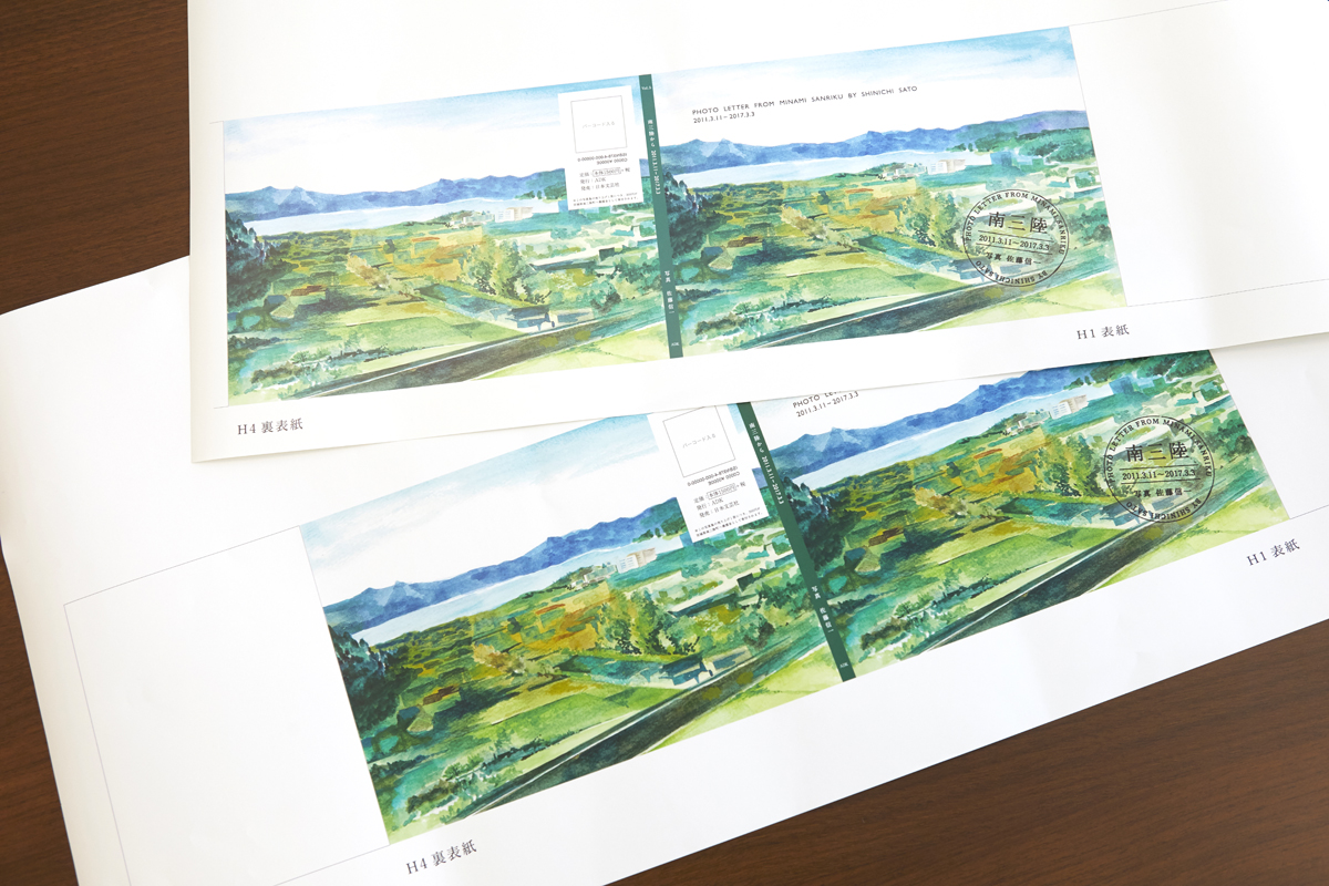 ▲同じく浜田さんのイラスト作品、写真集「南三陸から」第5弾の表紙カバーをP-5050で2回出力。カギとなる水彩の再現性も十分。(クリックで拡大) |