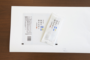 ▲同じく浜田さんのデザイン。かまぼこのパッケージ、特色指定がきちんと再現された。上は印刷物。(クリックで拡大) |