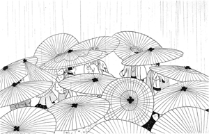 おせん「傘」(版画) よく似た絵柄が「おせん」の挿絵にあるのだが、この絵柄に関しては、版画の作品のほうが優れている。(クリックで拡大) |
