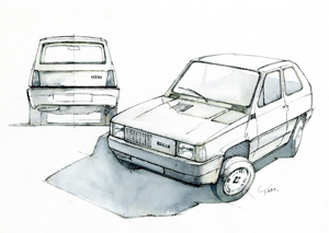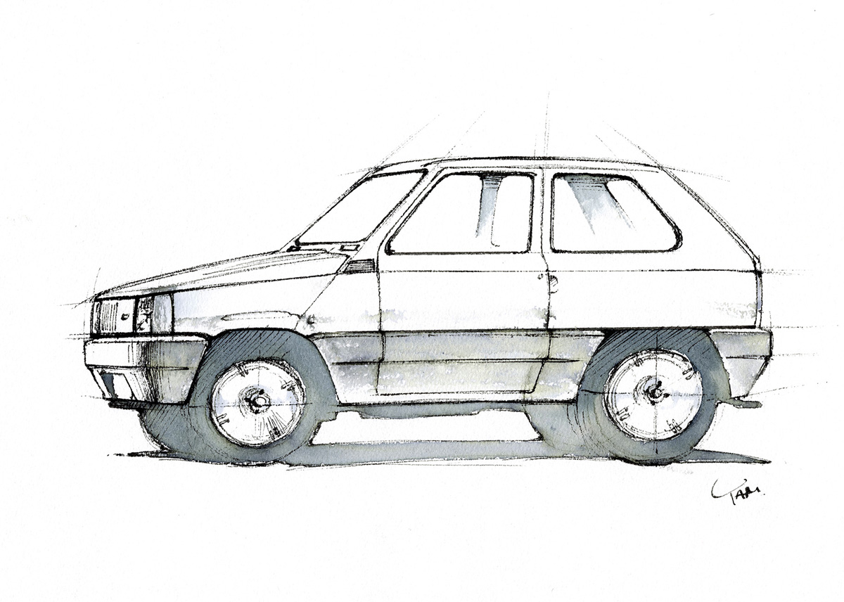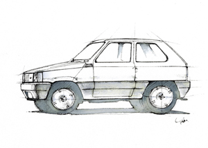 ジウジアーロが42歳の時にデザインしたフィアット「パンダ」(1980年)。筆者によるスケッチ(以下同)(クリックで拡大) |