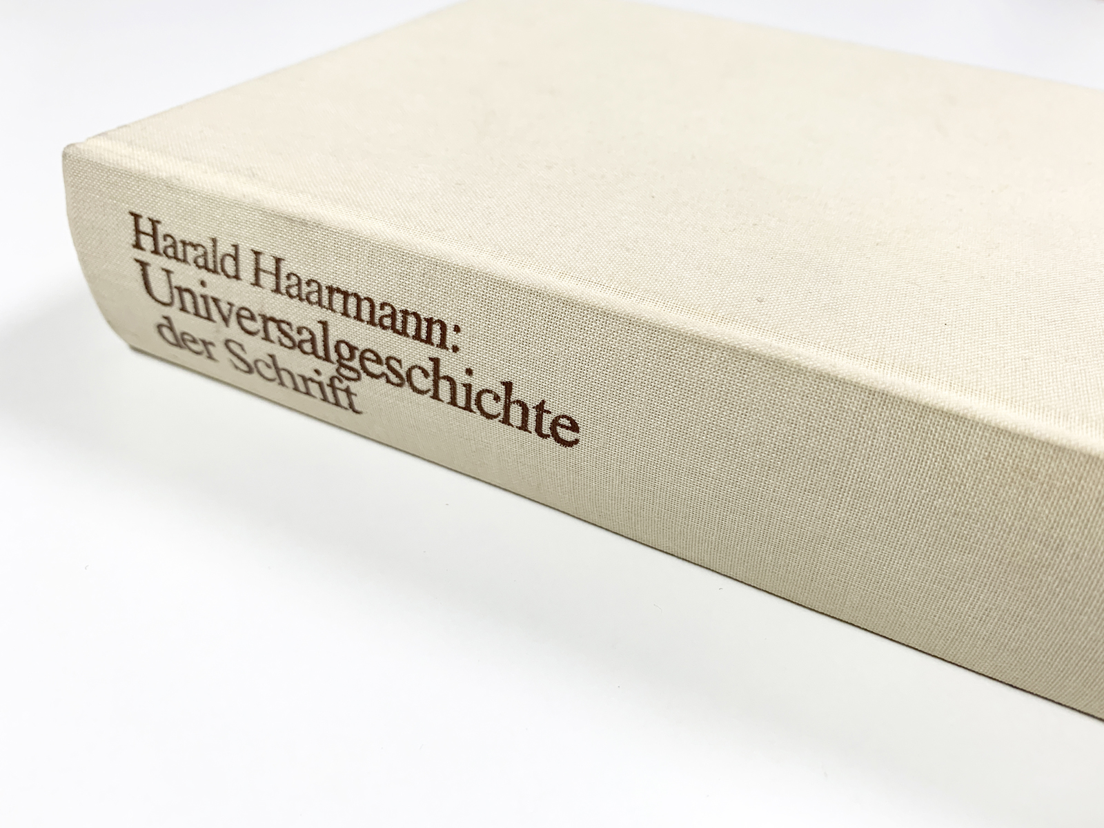 Haarmann, Harald『Universalgeschichte der Schrift』(1991年)。世界の文字文化(歴史とシステム)に関するこの専門書は、私が学生時代に初めて自費で購入した本の1つ。文字システムへの関心、そして日本の文字システムをどのように分かりやすく国際的に解説できるかについてこの頃から考え出していた。現在も参考にしている本。(クリックで拡大) |