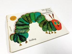 Carle, Eric『Die kleine Raupe Nimmersatt』。エリック・カールの『はらぺこあおむし』(1969年)。子どもの時に親からもらった絵本。おそらく、私がもっとも長く所有している本。ハードカバーの背表紙がボロボロ。珍しく、書き込みも落書きもない。(クリックで拡大)