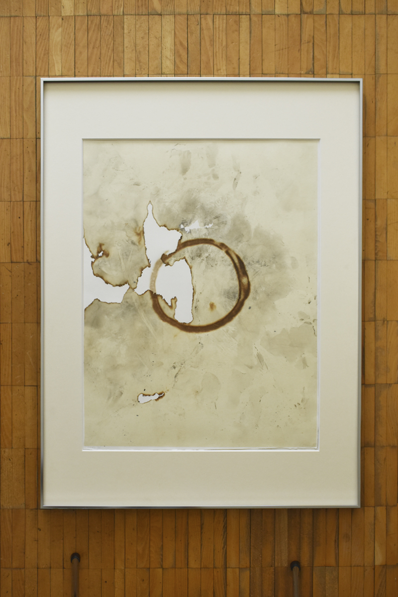 コーヒーのシミのような跡、燃やされて歪にあいた穴が、生成りの紙面に広がる。なにやら印刷物からの文字の転写もうっすらと見える。あいてしまった穴は、どこかの大陸のようにも、そらを飛ぶ鳥のようにも見える。