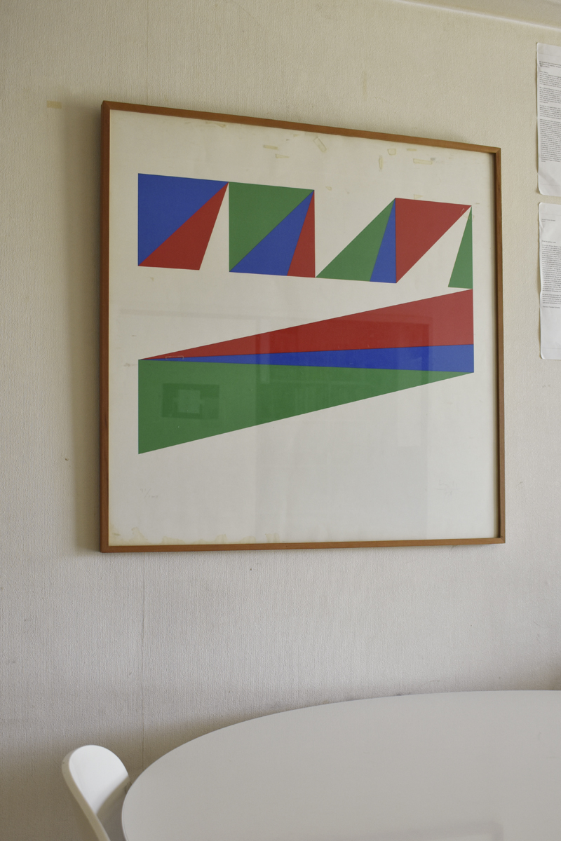 物心ついたころから居間に飾ってあったのは、マックス・ビル(1908年-1994年。スイスの彫刻家、建築家、工業デザイナー)の作品。タイトルも制作年も分からないが、ビルが「コンクリートアート」と呼ぶものの1つだと思われる。シルク印刷。