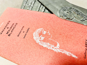 『メゾン・ブランシュでの休暇』 ウニカ・チュルン、宮川尚理訳、ガレリア・アミカ、2001年。表紙カバーはスミと白の2色箔押し。本文(図版入り)も全ページ樹脂凸版印刷。写真右は箔の金属凸版。(クリックで拡大) |