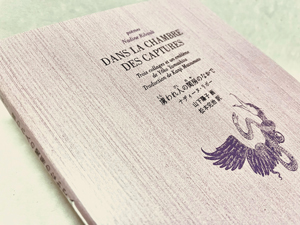 『虜われ人の閨房のなかで』ナディーヌ・リボー、松本完治訳、山下陽子画、エディション・イレーヌ、2014年。紫色で筋柄が刷られた表紙の板紙は、製函・包装紙向けの用紙を特別に分けていただいたもの。表紙と背に、スミ箔・紫箔押し。本文は、グレーのラシャ紙に菫色の特色1色刷り。製本は、スクラム製本の本文と薄い背を作った板紙表紙を手製で三点糸綴じを依頼。(クリックで拡大) |