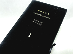 『散歩者の扉』並装版、佐々木聖、山下陽子画、edition SHISH。詩・画・造本の三者の相談により、かなり縦に長い判型で2つ折のカード数葉に、それぞれ言葉と画を配置し、リボンと筒函に収める形態に。函は黒のビロード合紙で揃え、タイトルなどを金箔押し。(クリックで拡大) |