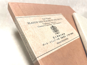 『花と果実の紋章』 ポール・エリュアール、佐藤巌訳、山下陽子銅版画、エディシオン・アクネ、2006年。本文を活版印刷、挿画を色インクの銅版画で印刷、という詩画集を制作し、同時にふさわしい夫婦函を制作すべく、作家が見つけた色染め和紙(雁皮紙)を用い、白く透ける雁皮紙に樹脂凸版刷りの題箋貼り。もっとも華奢で角の立った夫婦函の設計見本を渡して製函を依頼。(クリックで拡大) |