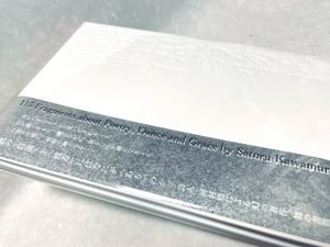 『純粋思考物体』 河村悟、テテクイカ、2022年。「純粋思考」という言葉を標榜する詩人の断章集に、白く透明な物体を目指して。純白の厚いボール紙を表紙・背表紙として、本文も純白の書籍用紙。表紙は大きくタイトルと著者名を透明箔押しのみ。帯は銀紙に白刷り。その上から透明フィルムのカバーをかけ、背タイトルと帯の欧文フレーズを黒でシルクスクリーン印刷。製本はもっとも開きのよい製本、コデックス装。(クリックで拡大) |