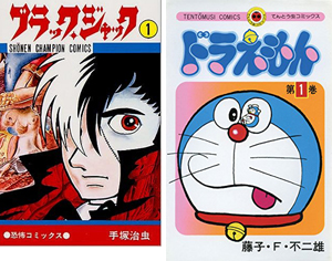 手塚治虫「ブラック・ジャック1」(秋田書店)と藤子・F・ 不二雄「ドラえもん (1)」(小学館) |