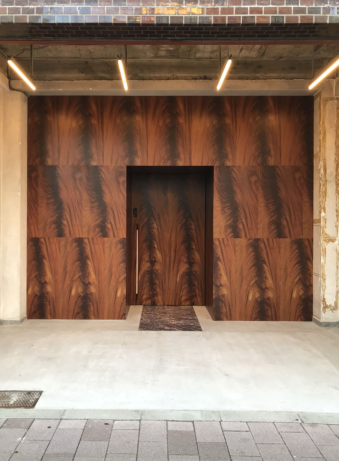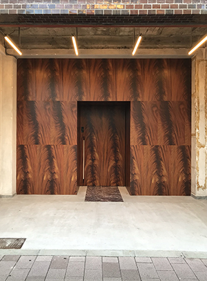 ある時、前述したようなフェイクの木目が貼られている壁に出合った。きわめて写真的に表現されたその壁紙の反復を繰り返す没個性的なパターンを目にした時、偽物であることをむしろ堂々と認めているようで新しく目に映った。それはおそらく制作者の意図とは異なる受け取りかもしれないが、街中に無作為に出現したそれの鮮やかな印象は、昭和期の個性的な建物に出合った時とある意味同質な、ものの見方に訴えてくるものがあった。時代とともに自身の捉え方や物差しもまた変わっていくことで、個人の美意識もまた更新される。無造作に貼り付けられた木目が私には潤って見えた。