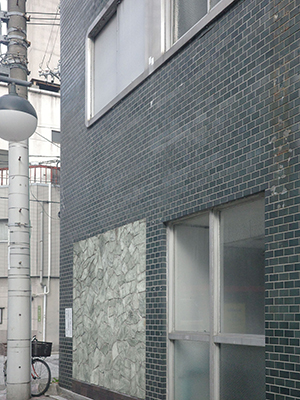角Rのサッシ、一部に石が埋め込まれたファサード。(クリックで拡大) |