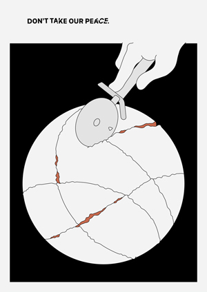 2022年3月1日。ウクライナ侵攻がはじまった5日後に制作。なぜとりあうのか。人の欲望でつくられた国境について考える。とりあわないで。というメッセージは、持っている側からの視点であることも承知しつつ。(クリックで拡大) |