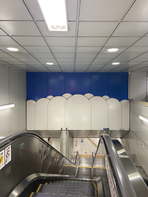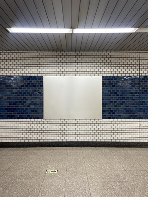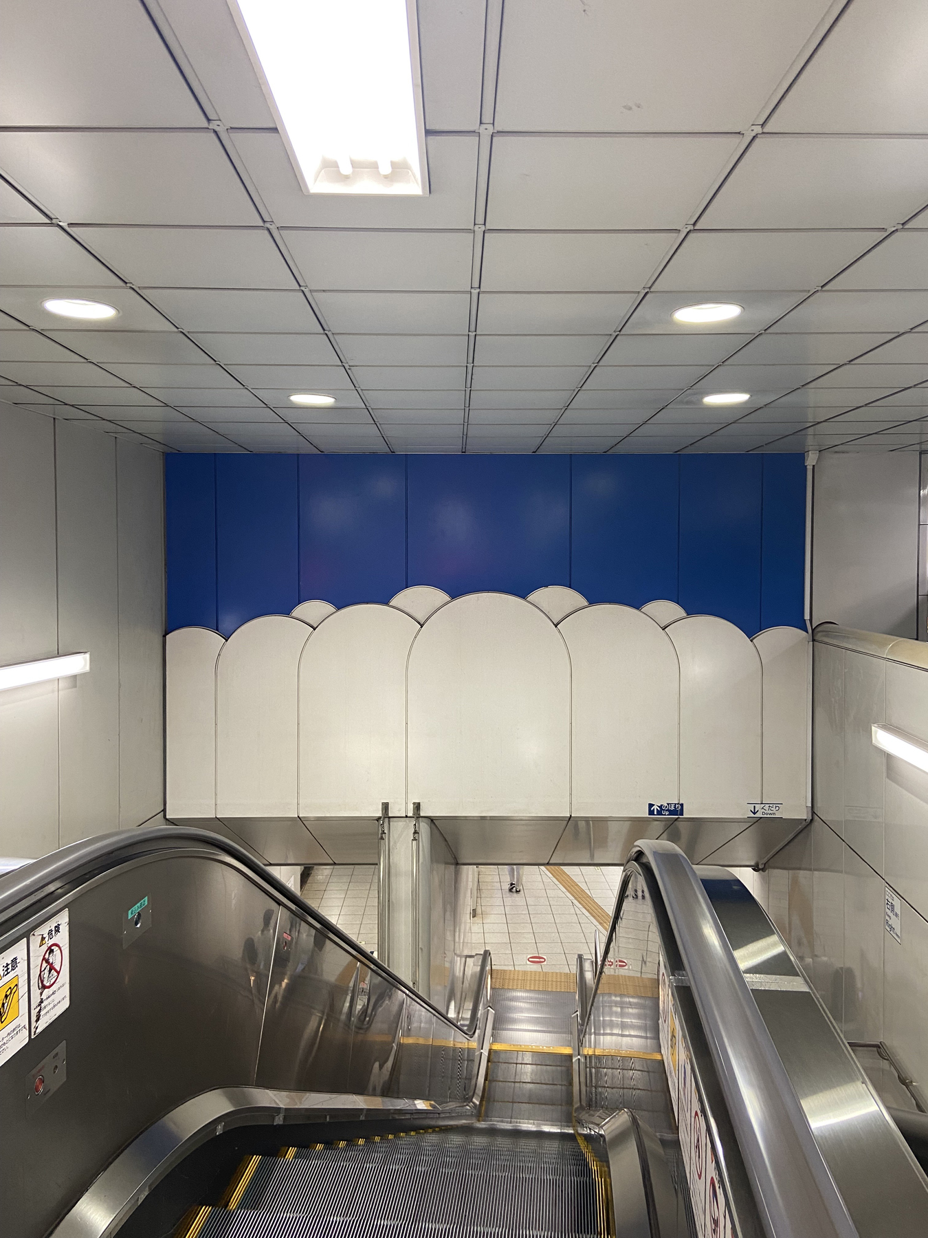 ▲2023/06/04。場所不明。両側にある紺色のタイルがすてきだと思った。まんなかのスペースは「本来広告とかポスターとか貼りそうな場所にいまは何もないやつ」と呼んでいる。(iPhone11で撮影)。(クリックで拡大) |