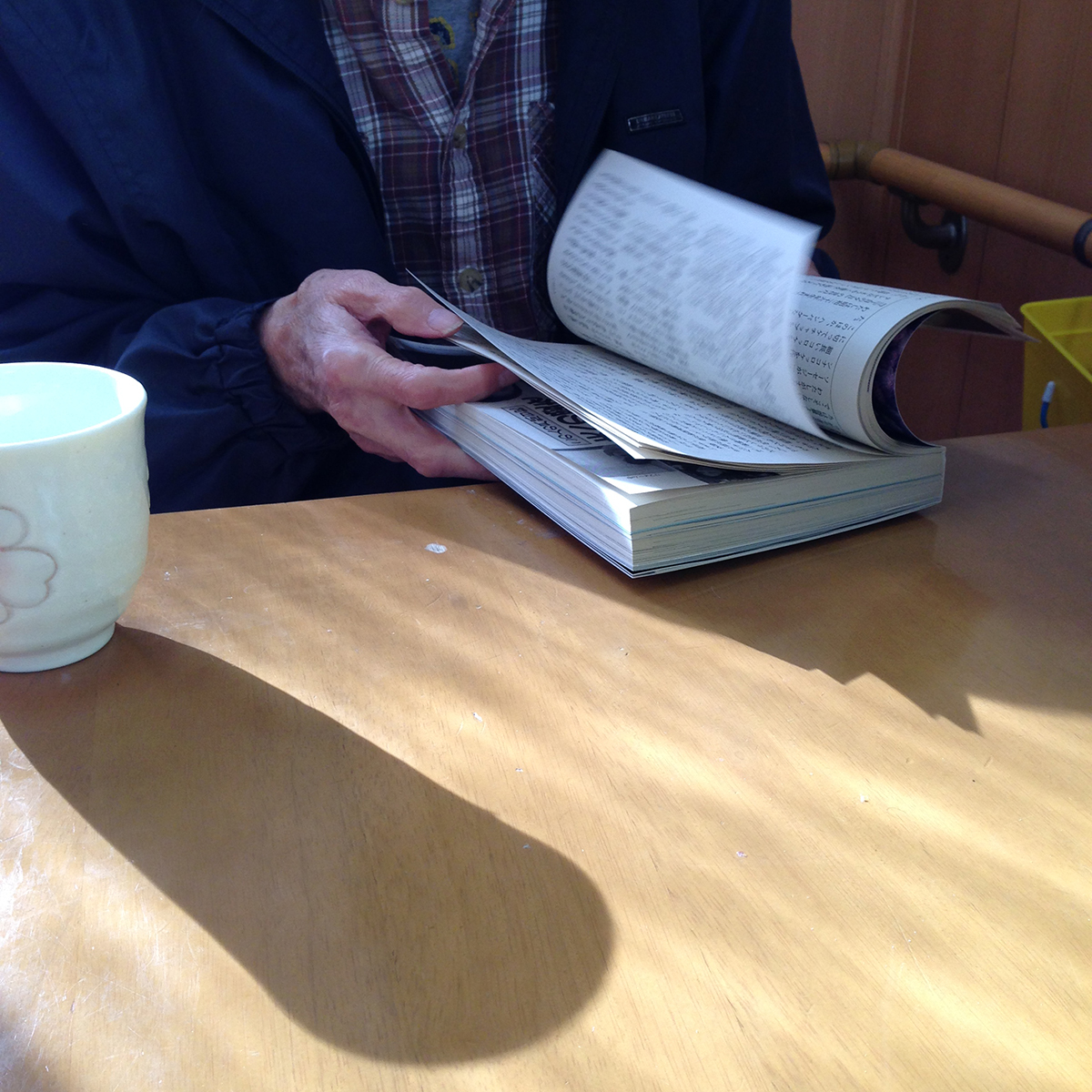 ▲活字好きな父は、白内障になっても雑誌をパラパラ。iPhoneで撮影 |