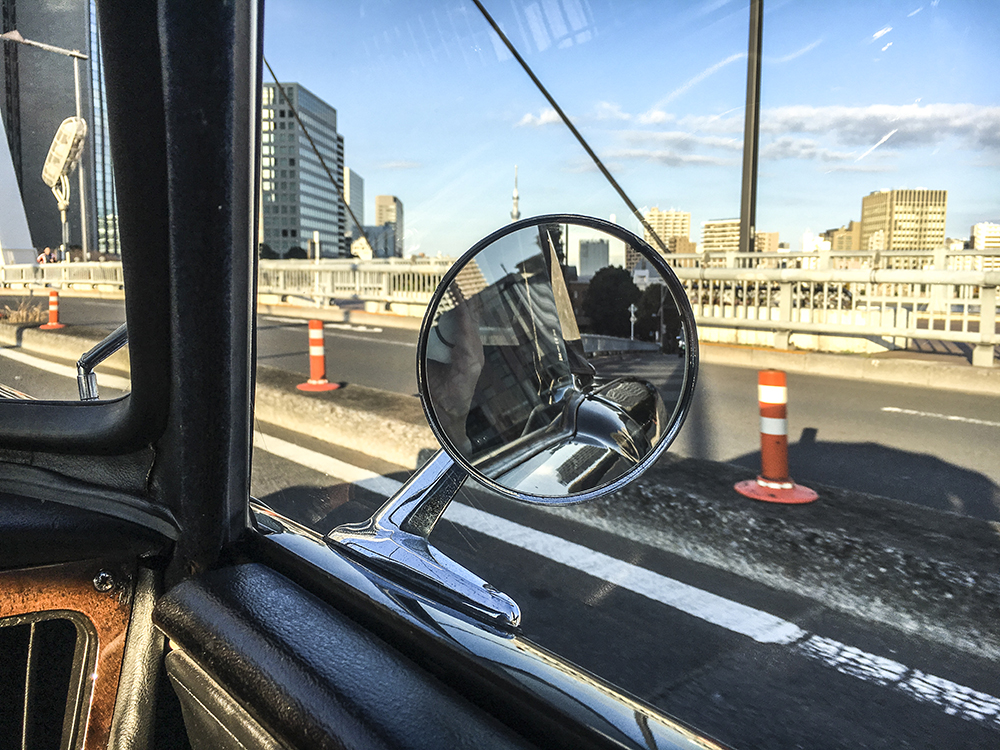 ▲丸いミラーに古き良き時代の美しさが凝縮。スカイツリーを眺めつつドライブ。 |