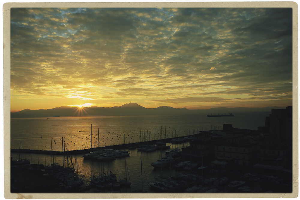 ▲早起きのご褒美!? ナポリの港から見た朝日。日曜日は出入りする舟も少なく静か。ここで取れた海の幸は絶品でした。もちろんピザも美味しかった |