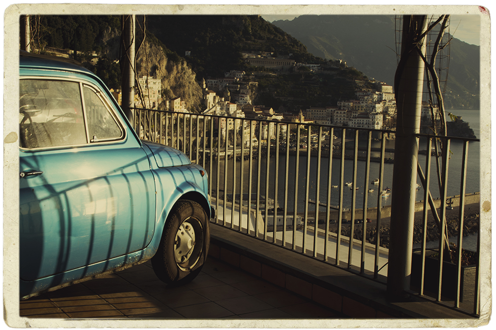 ▲アマルフィ海岸。レトロで可愛いイタリア車。美しい朝日の中で |