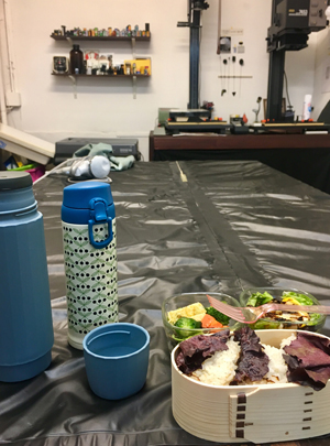 ▲写真1:暗室にて、畑の恵みと共にお昼(以下すべてiPhone 6sで撮影)。(クリックで拡大) |