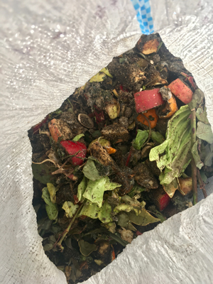土のう袋に、土と米ぬかと水を混ぜて発酵させ、その後、生ゴミを投入! 数日もすると、ふわふわした白い糸状菌とともに発酵します。ほんのり甘い森の香りがしたら、上手く発酵したサイン(写真2)。2、3日おきに生ゴミを入れて、2週間後(冬期の場合)にこれを土に還して、堆肥にします。