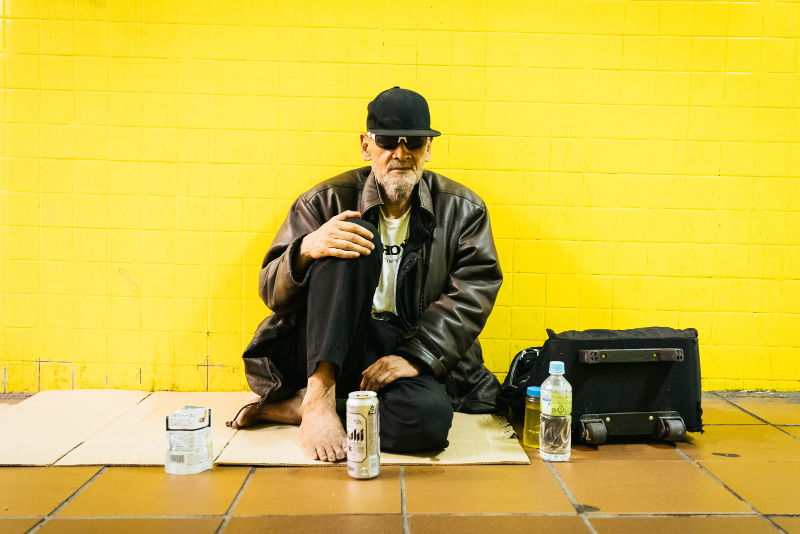 2018年7月某日。まだ誰もマスクなどつけていない、真夏の新宿。この日の私は、路上生活者の方と話がしたかった。大勢の人が通り過ぎていく傍ら、⼀緒にビールを飲みながら、1 時間ほど会話をした。「格好良く撮るから、ポートレートを撮らせてもらえないですか。」と頼んだら、嫌がりつつも応じてくれた。