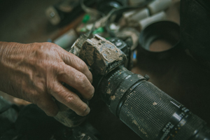 泥に汚れたカメラを手にしながら、