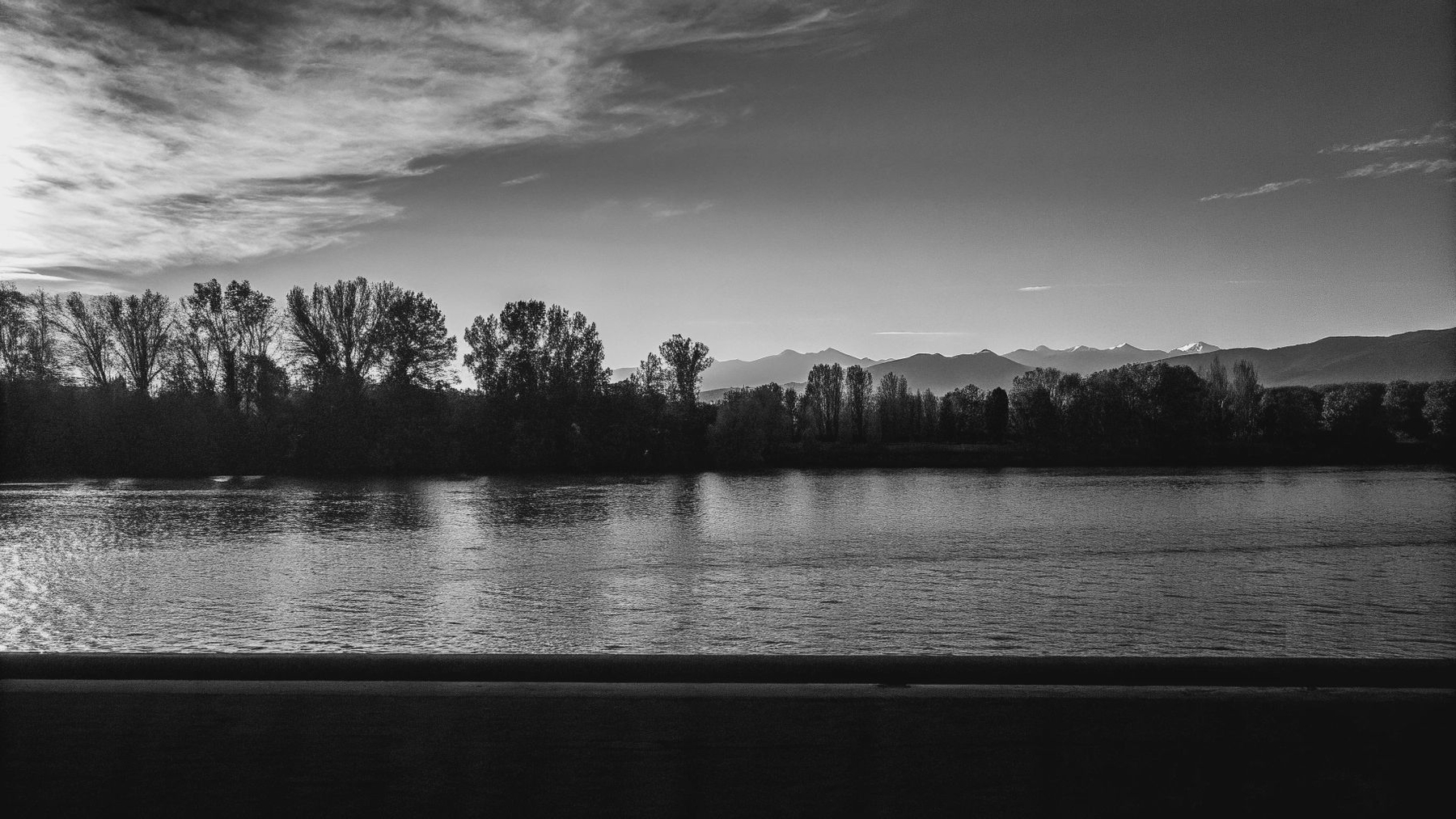 早朝、川沿いに響くスーパーカブのエンジン音を背に、モノクロの景色が広がる。空気の冷たさを感じながら撮影した1枚。(クリックで拡大)。 |