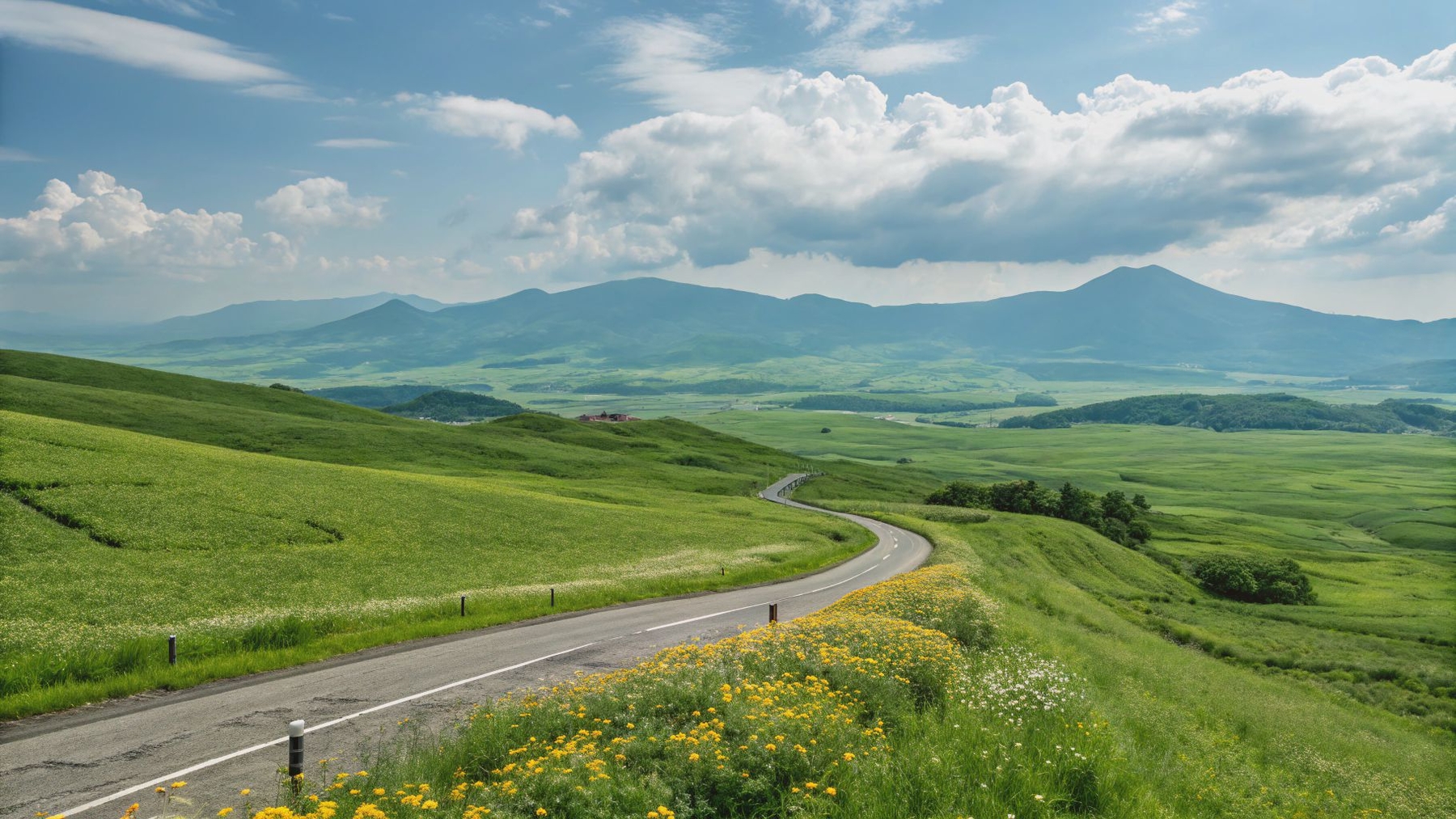 柔らかな風に揺れる花々と山並み。広がる自然の中を走る道は、未知の旅路への期待に満ちている。(クリックで拡大)。 |