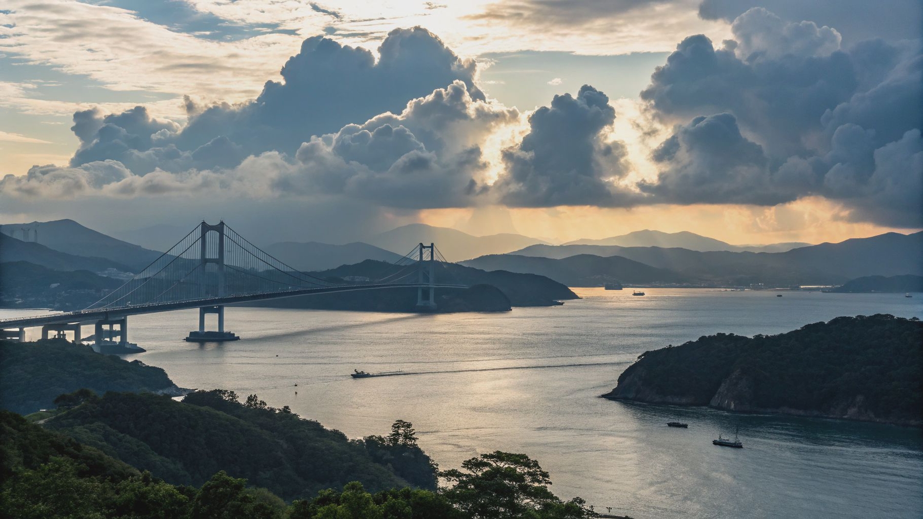 夕暮れ時、ドラマチックな雲が立ち込める。橋の向こうに沈む光が、新しい発見を約束してくれるかのようだ。(クリックで拡大)。 |