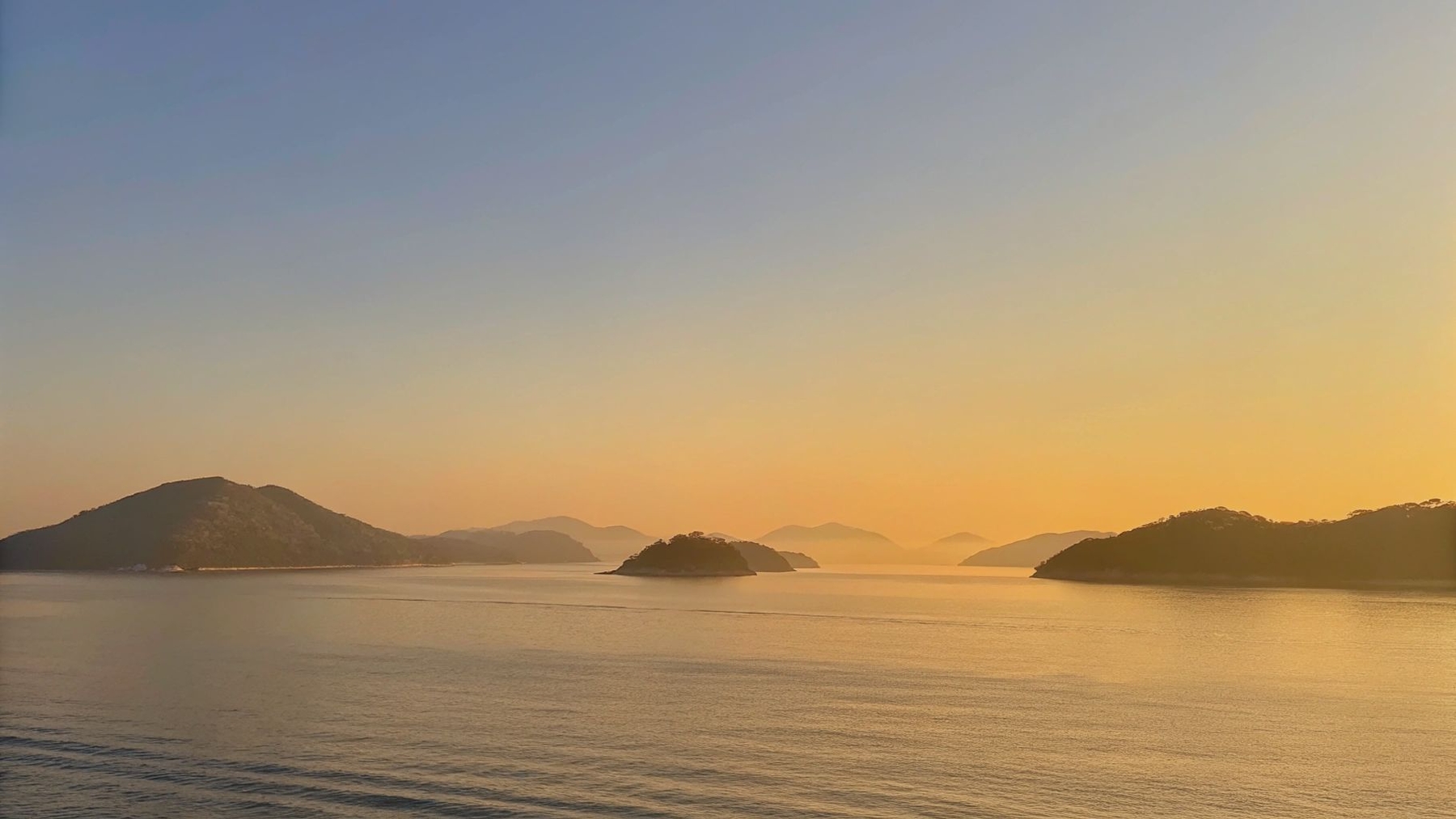 日没直後の穏やかな海。遠くの島々が霞む中、光が優しく水面を染める。旅の終わりに感じる安らぎ。(クリックで拡大)。 |