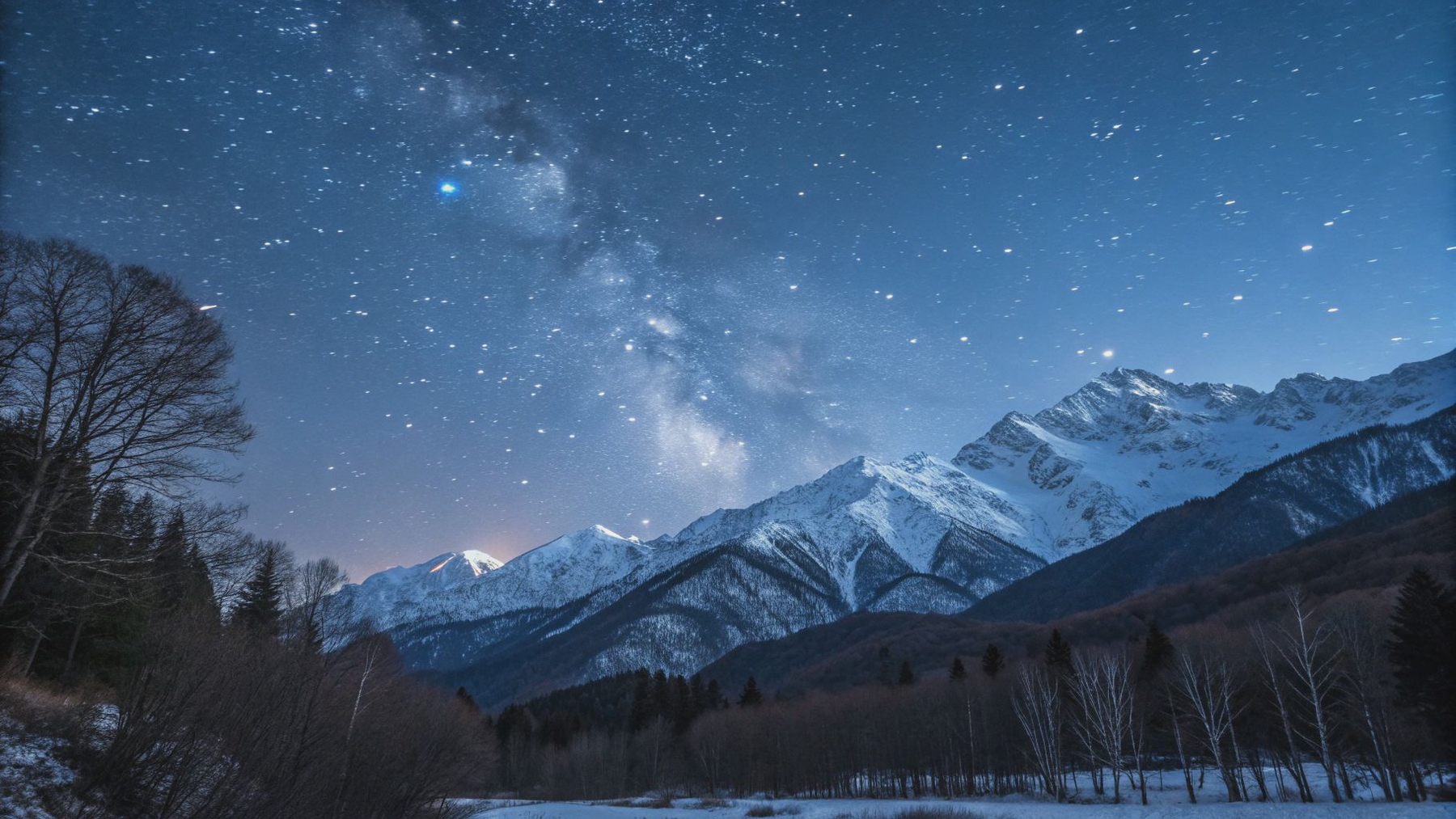 澄み切った夜空と雪山が織りなす神秘的な風景。息を呑む美しさに包まれた瞬間をカメラに刻む。(クリックで拡大)。 |