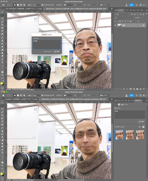 と、思っていたところ、ふと写真に写る人物の「顔」だけをPhotoshopに新しく装備された「生成りつぶし」機能を適用してみたらどうだろう? と言うアイデアが閃いた。「生成塗りつぶし」とはPhotoshopに新しく追加された、独自の生成AI機能で、写真の一部を選択しそこに無いものを加えたり、逆に邪魔なものを消したりもできる。
