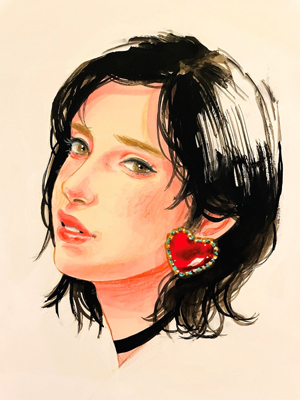 今回は実際のイヤリングを見ながら描きました。素材の質感を意識して描き分けます。人物がメインなので、細密な描き込みはしません。瞳や髪の色と馴染む色合いのアイテムを合わせるよう心がけています。
