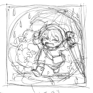 (1)キャラクターを中心に全体的なイメージを大まかに描いていきます。ラフは細かいところまでは描かず全体のイメージを掴むための作業なので上手に描こうとせずとにかく手を動かして形を掴みます。アイコン表示された時を意識して円のガイドを入れておきます。